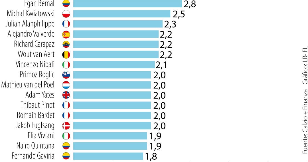 En el listado hay solo cuatro ciclistas latinoamericanos: tres deportistas de Colombia junto al ecuatoriano Richard Carapaz, del IneosEl portal Calcio e Finanza dio a conocer el ranking de los ciclis… [+1741 chars]
