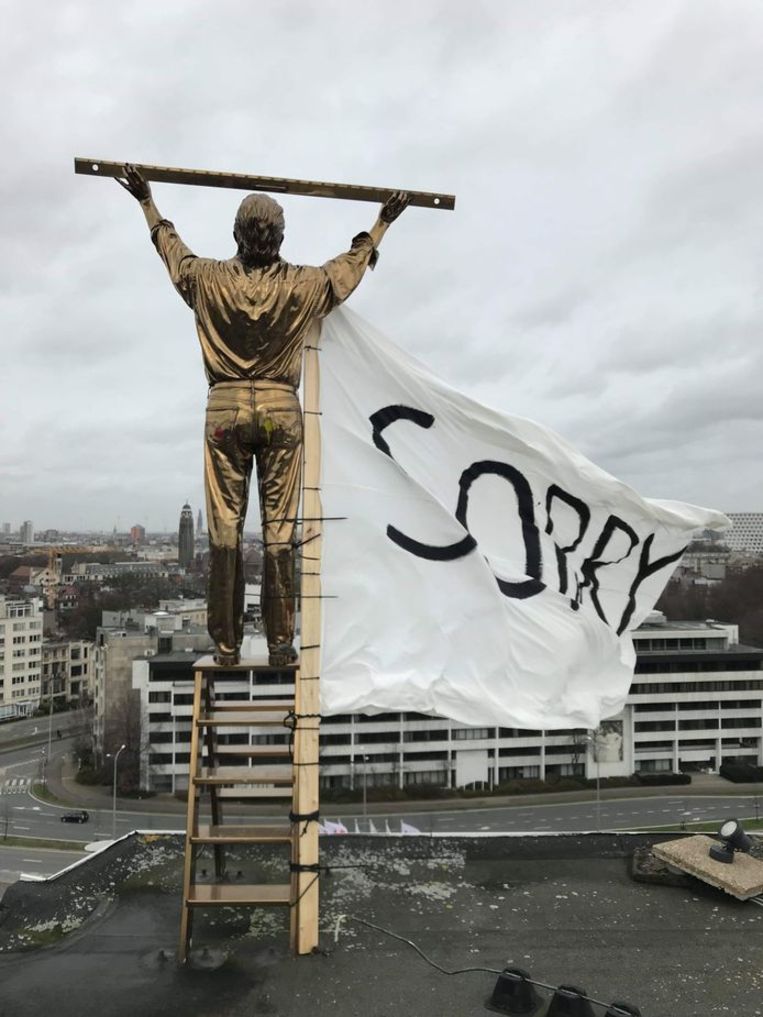 Een spandoek met de boodschap Sorry wordt aan Fabres kunstwerk De man die de wolken meet gehangen.Beeld Studenten Conservatorium Antwerpen Bij Troubleyn, het theatergezelschap van de Belgische kunst… [+4577 chars]
