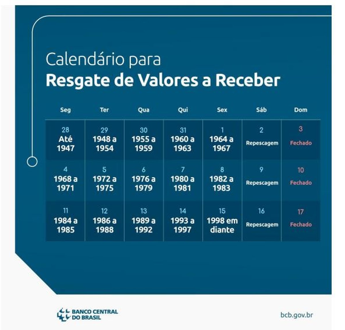 O Banco Central dá início nesta segunda-feira (28) a mais uma 'repescagem' para os saques da primeira fase dos recursos esquecidos por brasileiros nos bancos, pelo sistema Valores a Receber. Essa rep… [+4083 chars]