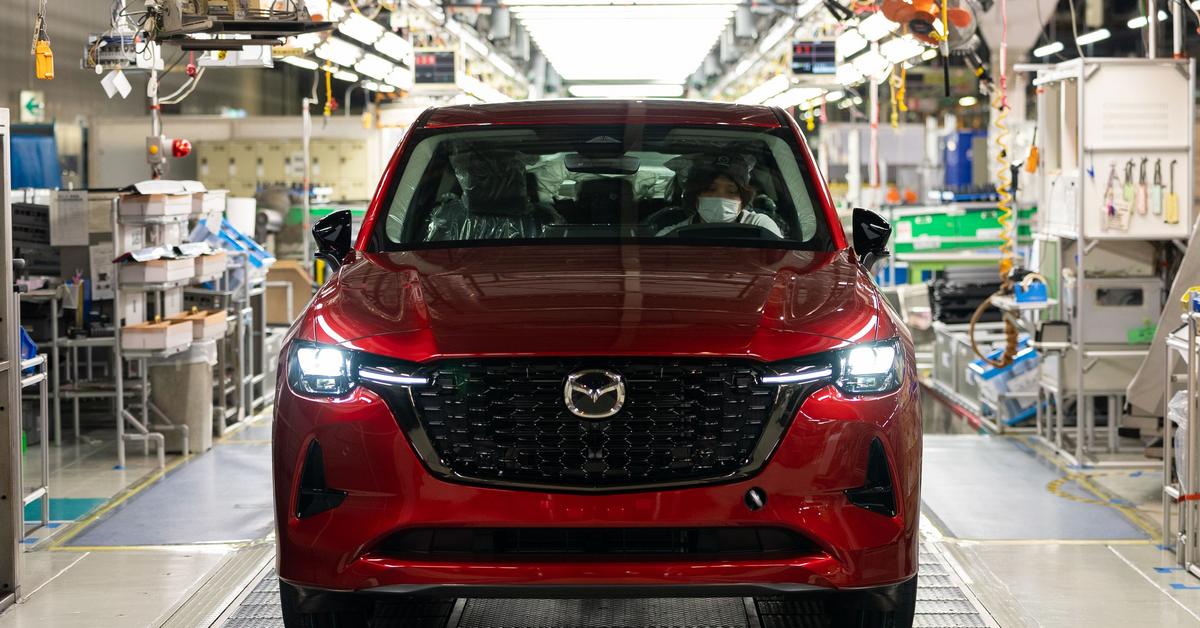 Mazda CX-60 w wersji Homura polakierowana czerwieni Soul Red Crystal na 20-calowych felgach i z czarnym skrzydem pod kratownic grilla to pierwsza seryjna sztuka wyprodukowana w zakadzie nr 2 fabryki … [+4442 chars]