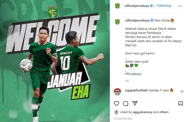 BOLASPORT.COM - Persebaya Surabaya resmi mengumumkan rekrutan anyar mereka, yakni Januar Eka Ramadhan yang berposisi sebagai striker. Pemain kelahiran Cilegon, Banten itu menjadi pemain anyar keempa… [+974 chars]