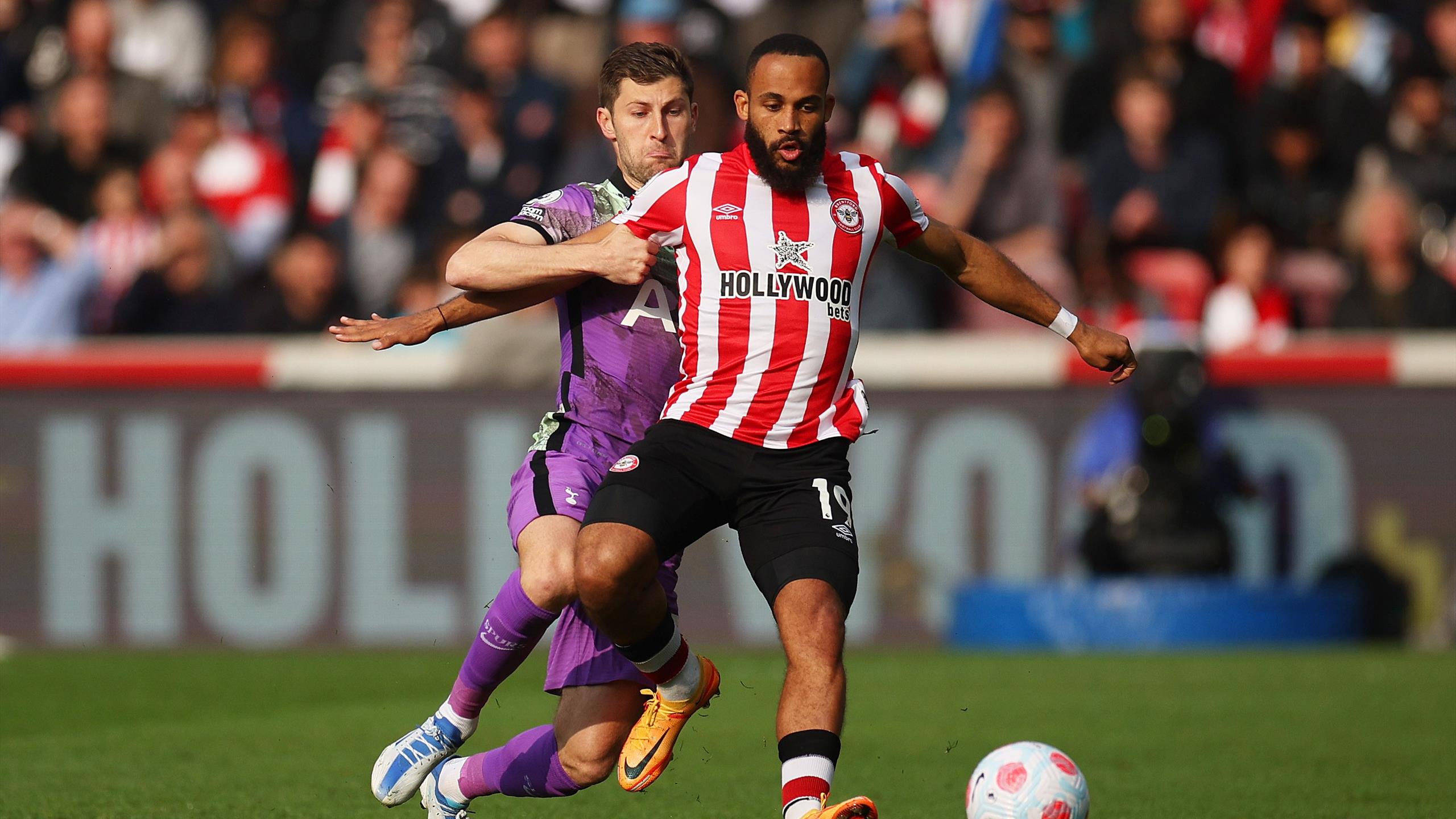 Bryan Mbeumo of Brentford is challenged by Ben Davies of Tottenham Hotspur during the Premier League match between Brentford and Tottenham Hotspur at Brentford Community Stadium on April 23, 2022 in … [+40 chars]