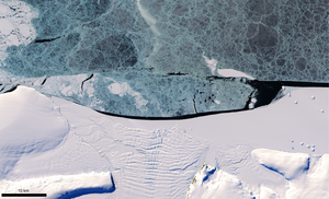 image: Young (blue) and landfast (smooth white) sea ice offshore of New Bedford Inlet, eastern Antarctic Peninsula, as imaged by the Operational Land Imager instrument onboard the USGS/NASA Landsat 8… [+5006 chars]
