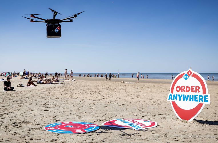 2020: een drone met daaronder een box om pizzas in te voeren tijdens een test op het strand van Zandvoort. Pizzaketen Dominos wil pizzas gaan bezorgen met drones.Beeld ANP Drones kunnen maaltijden b… [+2822 chars]
