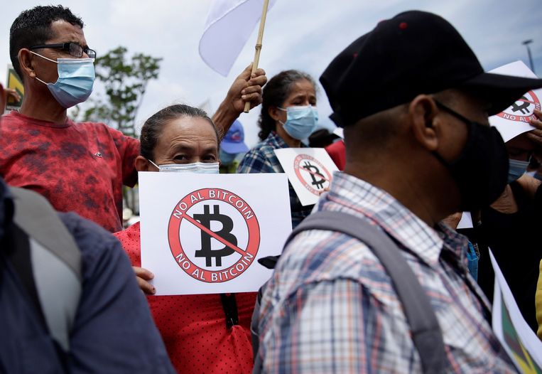 Een groep ex-guerrillastrijders en veteranen van het leger van El Salvador protesteerde op 27 augustus 2021 onder meer tegen het gebruik van de bitcoin als wettig betaalmiddel.Beeld Rodrigo Sura / EP… [+3854 chars]