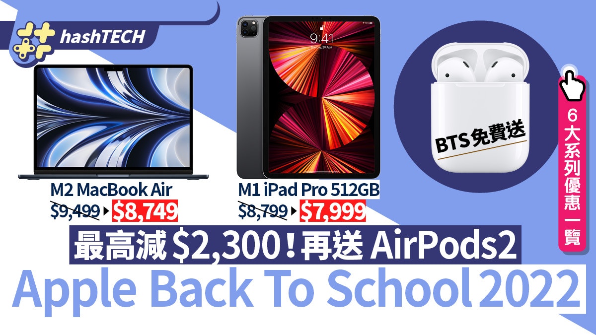 Back to School 2022 Apple Apple Back to School 2022 9 26 Mac iPad HK$2,300 AirPods HK$400 AirPods 3HK$900 AirPods Pro MacBook ProMacBook AiriMac 24"iPad ProiPad Air Mac $2,300 16 MacBook Pro10 … [+223 chars]