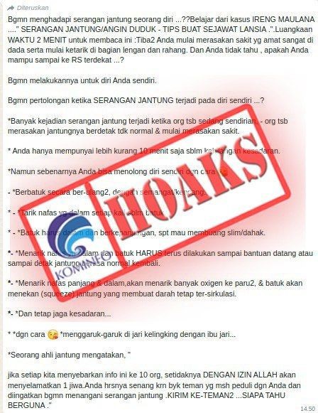 Penjelasan : Telah beredar pesan berantai berisi sebuah informasi yang mengatakan bahwa cara menghadapi serangan jantung yaitu dengan cara batuk berulang-ulang. Faktanya, dilansir dari liputan6.com… [+810 chars]
