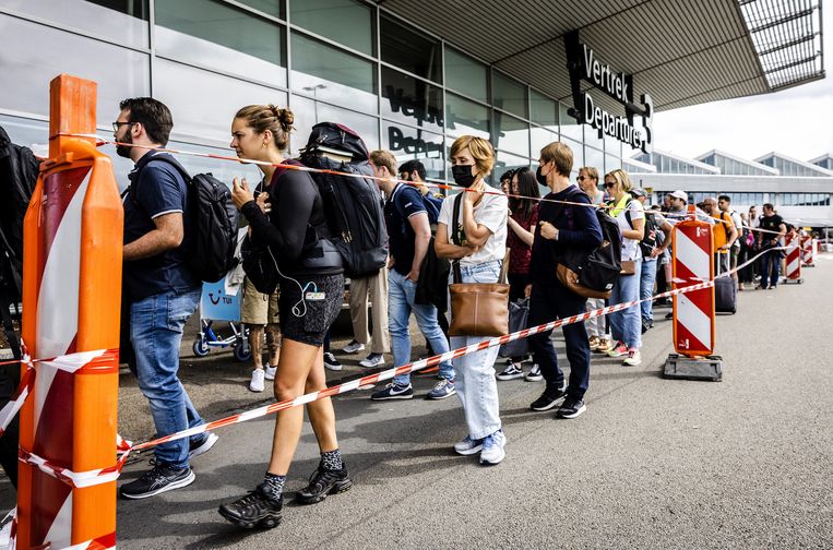 Passagiers wachten binnen en buiten de vertrekhallen op Schiphol in lange rijen voor de paspoortcontrole.Beeld ANP / Jeffrey Groeneweg Op de eigen site waarschuwt Schiphol voor piekdrukte. De luchth… [+3543 chars]