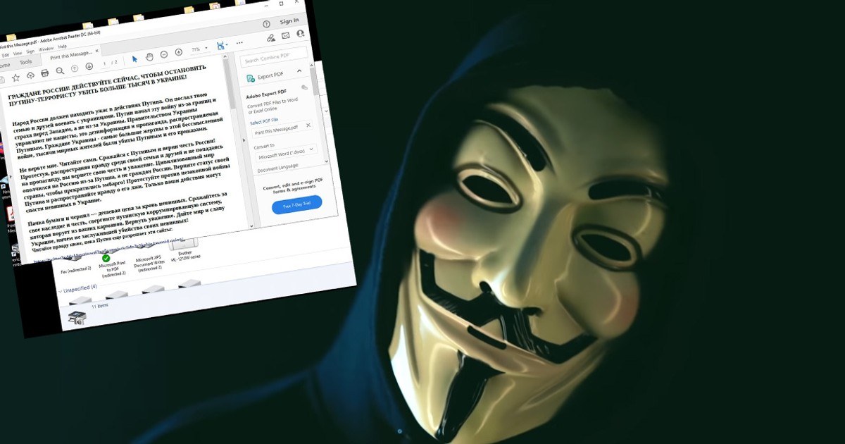 Grupa Anonymous poinformowaa w wiadomoci, e przez dwie godziny drukowali ulotki antypropagandowe drukowalimy instrukcje walki z propagand i instalacji TOR na drukarkach w caej Rosji czytamy na Twitte… [+1536 chars]
