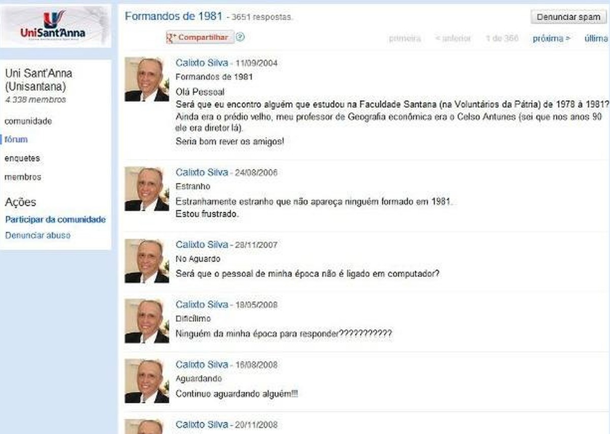 "Se puder criar comunidades, eu volto a fazê-la", afirmou o professor Calixto Silva Neto, de Sorocaba (SP), conhecido pelo "maior vácuo do Orkut" e que tenta reunir a turma da faculdade há quase duas… [+5451 chars]